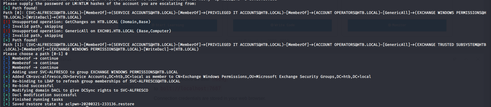 - For all this, we can use the Fox IT tool aclpwn. As can be seen, we have chosen path 0 (it was tested and both the paths work).