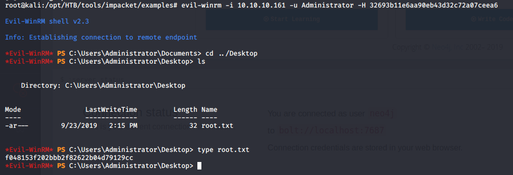 - Since we now have the hashes, we can use it directly with evil-winrm to log in and grab the root flag.