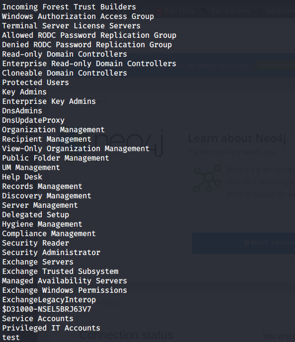 - Below are the groups available in the domain. Some of the groups listed have some default DACLs which can be abused. For example, by default, the group “Exchange Windows Permissions” has default behavior of WriteDACL onto the domain object.