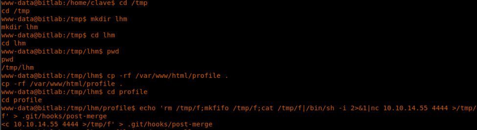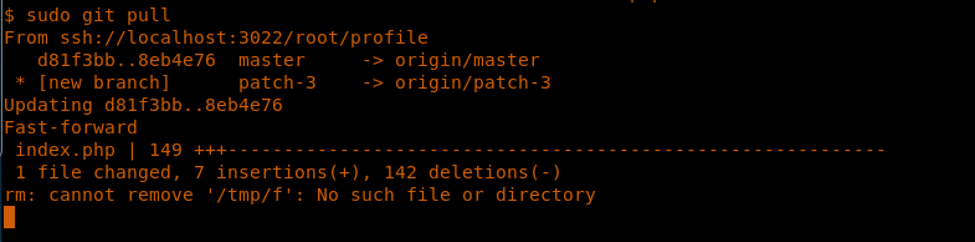 - After that if we can run the command git pull, which will effectively be git fetch + git merge, it should execute the above and create a hook to give the reverse shell back.