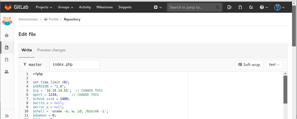 - After initial enumeration, it was found that the index.php file was editable by the user. So now we can deposit the reverse shell into it, as shown below.