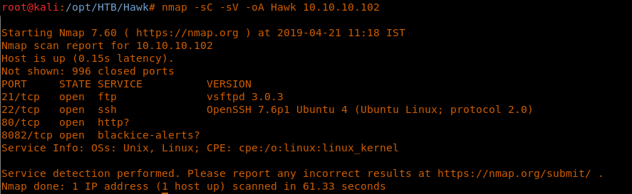 <<nmap -sC -sV -oA Hawk 10.10.10.102>>