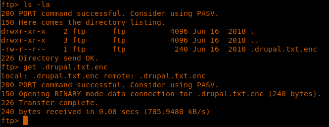 7. Enumerating the directory contents reveals a .drupal.txt.enc file.