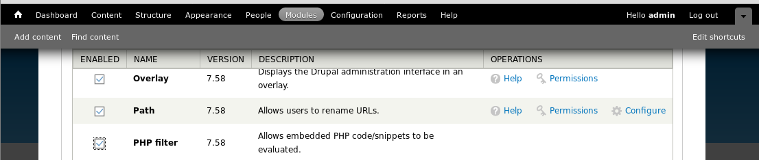 12. Enumerating the portal under modules, we can enable the PHP filter which will allow the execution of PHP code/snippets. Make sure to save the filter as well.