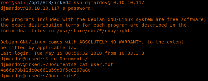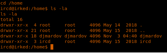 18. We got the directory for user “djmardov.” Under Documents, there is a user.txt, but it looks like permission is denied. Because we are currently under the ircd user, we need to escalate to djmardov.