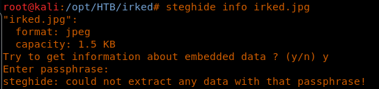 8. Back to enumeration of the image on port 80. Download the file and run steghide on it. It looks like there is embedded data in the box. I tried with a blank passphrase but could not extract the data, which means we need to find the key for it.