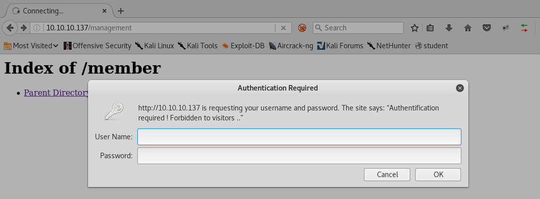14. Hovering over the /management directory, it asks for username and password, which we do not have as of now.