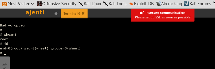 25. And we are in. Super! Inside, there was a simple way to spawn a new terminal which looks like the service is running as root. We got directly landed into root.