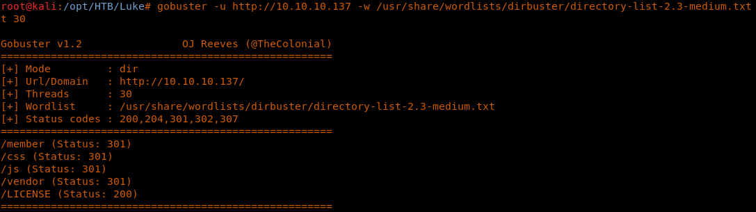 <<gobuster -u http://10.10.10.137 -w /usr/share/wordlists/dirbuster/directory-list-2.3-medium.txt -t 30>>