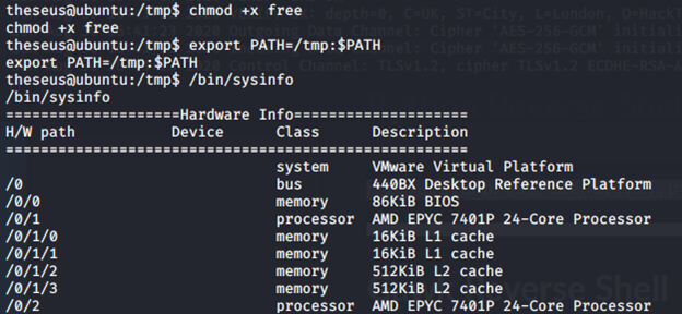 - Since their explicit location is not used, we can exploit any such commands by hijacking the control flow through our malicious binary. Below is the malicious “free” binary: