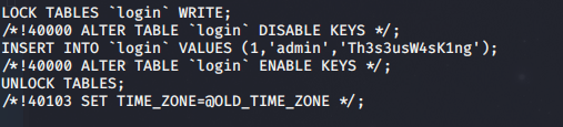 - Using mysqldump to dump the DB revealed another password, as shown below.
