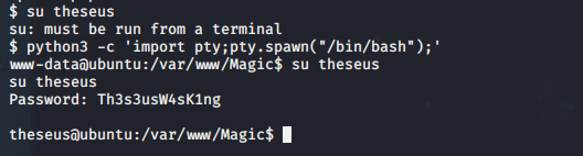 - Using this password to sudo to user “theseus” was a success. Before that, we need to upgrade our current shell also, as shown below.