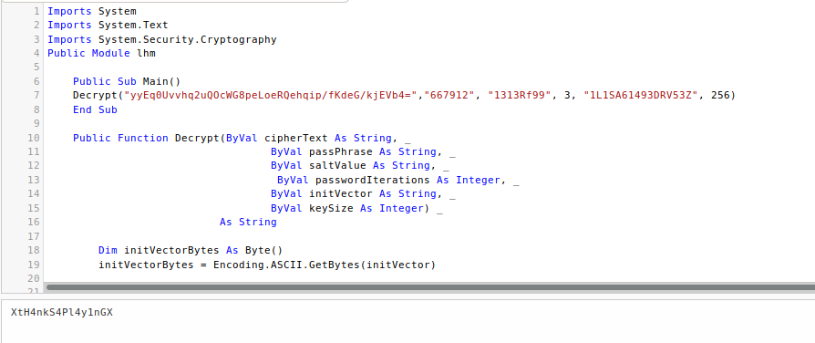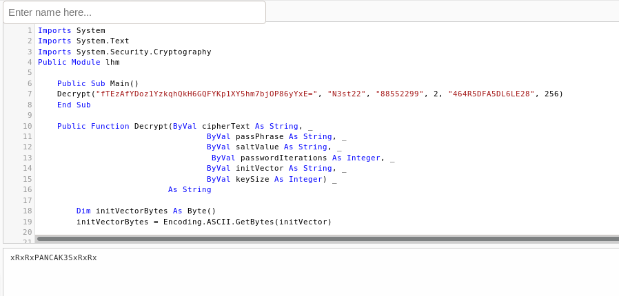 - Since this is a VB Project file, I could see that there are encrypt and decrypt functions. I modified the script a bit to only work with the decrypt function. The first parameter to this function was the hash, so I pasted in the hash we have recovered earlier and returned the password to the screen. [CLICK IMAGES TO ENLARGE]