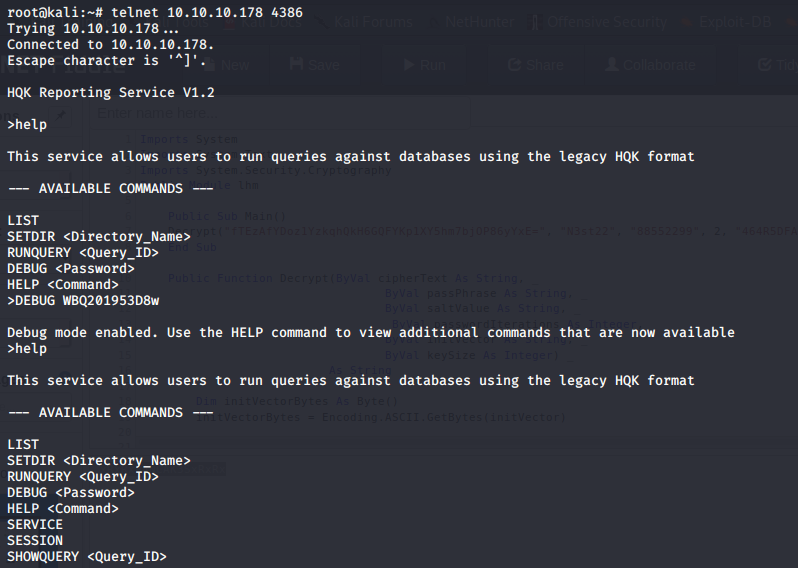 - Now, since service in port 4386 is mentioned, let’s connect to it via Telnet. We can do that successfully. Running the help command reveals some interesting commands and, and the debug command has a password option. Running that command with the recovered password and listing out help gives some more options.