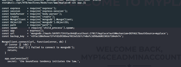 - Looking into one of the files(app.js), we got below code that states that MongoDB is in usage. We also see the password to connect to it.