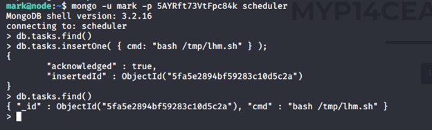 - Now, let’s connect to MongoDB using mark’s credentials and add a task to execute the reverse shell, as shown below.