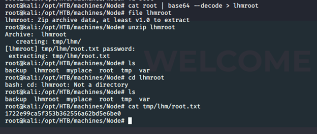 - After that, we got a similar backup file generated (similar to the one we saw earlier). We’re base64-decoding it and extracting the zip archive to retrieve the root flag.