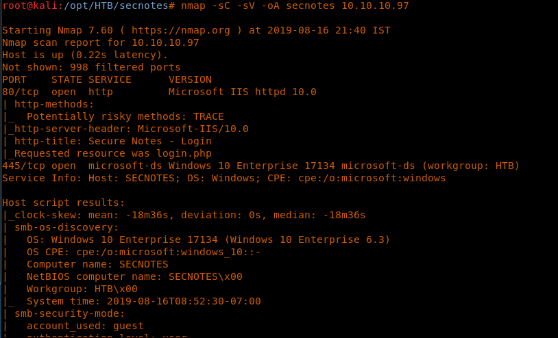 <<nmap -sC -sV -oA SecNotes 10.10.10.97>>