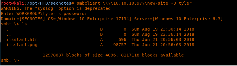 <<smbclient 10.10.10.97new-site -U tyler>>