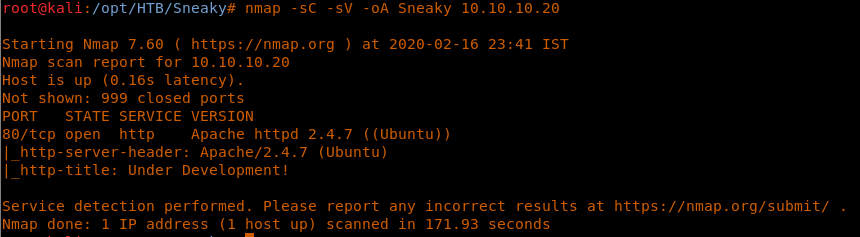 <<nmap -sC -sV -oA Sneaky 10.10.10.20>>