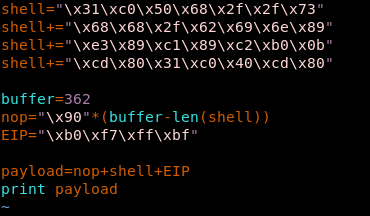 - After some trial and error, we see that below is the EIP and whole script that can be used to overflow the buffer and execute the shell code to spawn /bin/sh.
