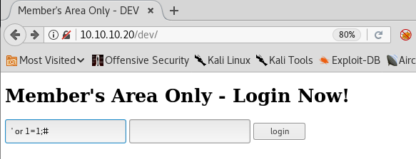 - Some initial testing showed that SQL injection is possible. So a trivial SQL injection got us in.