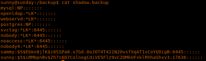 18. Looking into the shadow.backup file reveals the contents of sammy and sunny.