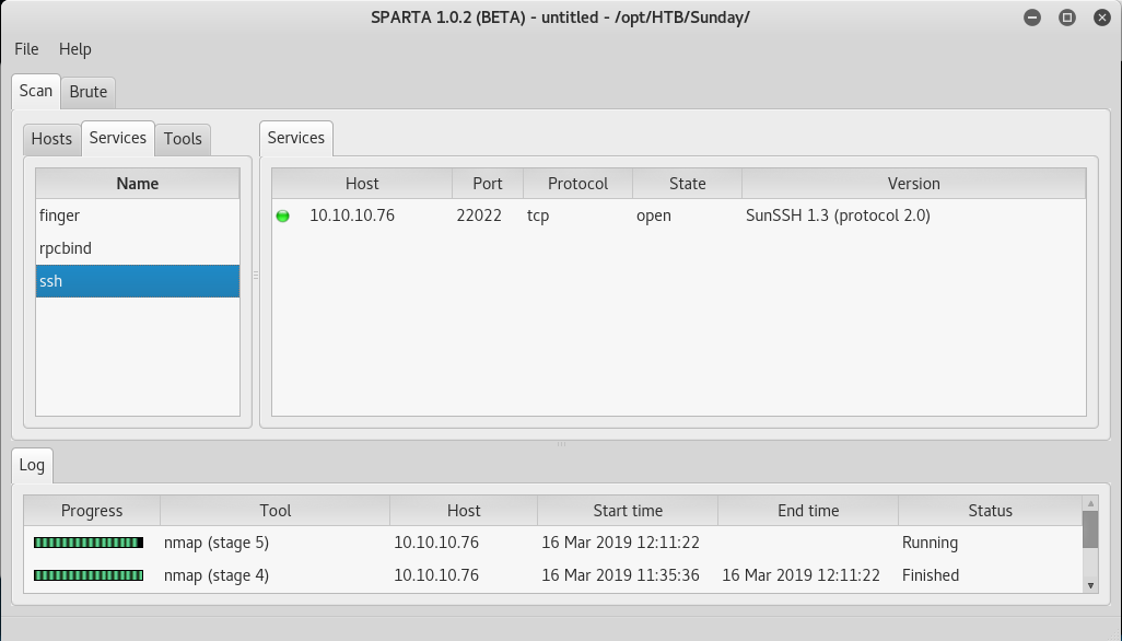 5. We got some juicy information such as finger service, but some common ports such as SSH and HTTP are missing. To make sure we do not miss out on ports, let’s use SPARTA to find out other ports as well.