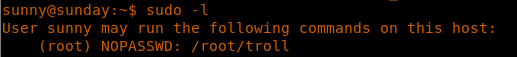 16. Looking into sudo permissions, sunny user can run the /root/troll file. Below is an example.