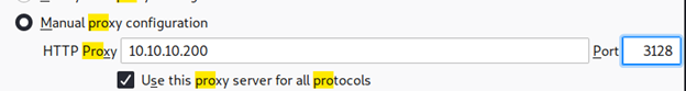 - Changing the browser to use the squid proxy details, as shown below: