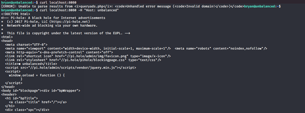 - Doing a curl on port 8080 shows that the domain is wrong, so we added “unbalanced” on request. It is successful and we got another IP address.