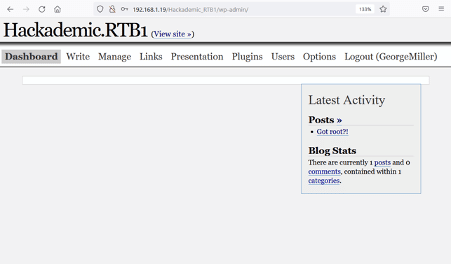 As seen above, we logged into the target application as user' georgemiller'. We need to find the functionality to upload the code to the target server. As this is an older version of WordPress, the functions seem different. We explored the admin panel and found the editor, which is seen in the screenshot below.