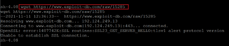 The download was unsuccessful due to a TLS error, so let us download the exploit on the attacker machine using wget utility for further usage.