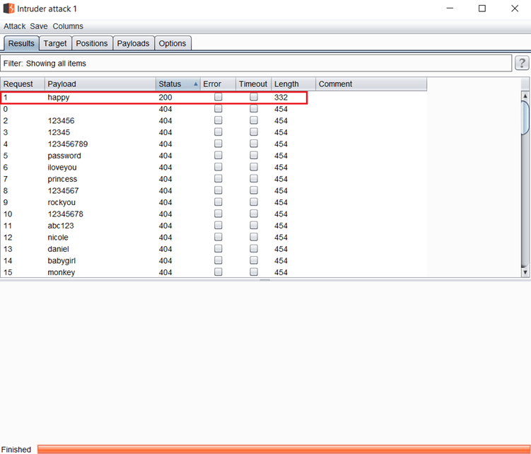 We clicked on the payload to configure the settings. In the payload options section, we pasted the wordlist contents as identified in the previous steps. Now, let’s execute the attack by clicking on the start attack option. The results can be seen below.