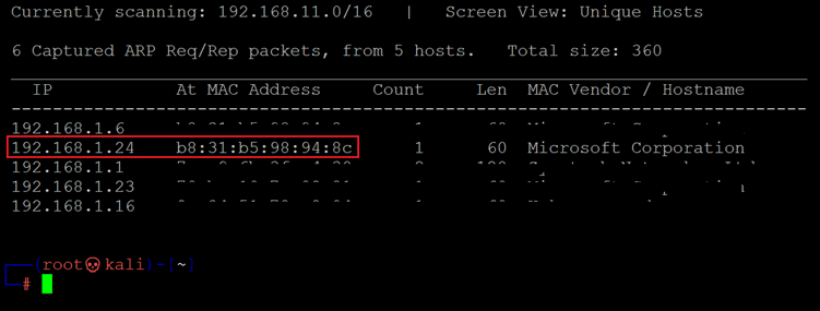 In the above screenshot, we can see that we have identified the IP address of all the devices connected to our router. Still, due to security reasons, we have hidden the MAC address of my personal connected devices. Our target machine IP address that we will be working on throughout this challenge is 192.168.1.24 (the target machine IP address).