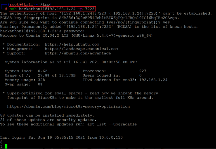 The credentials worked, and we are now logged into the target machine as user ‘hackathonll.’ In the next step, we will explore the target machine to find our way to the root.