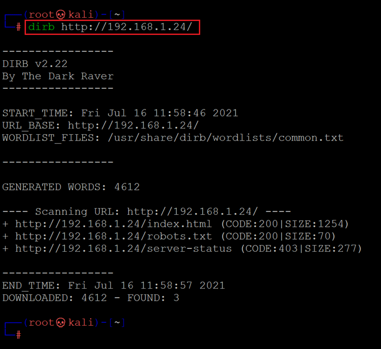 The webpage did not have any further functionality or login to explore. We decided to further enumerate hidden files and folders on the target web application. For this, we used the Dirb tool, which is used to brute force standard files and folders in web applications. The tool is available in Kali Linux. The scan command and results can be seen in the following screenshot.
