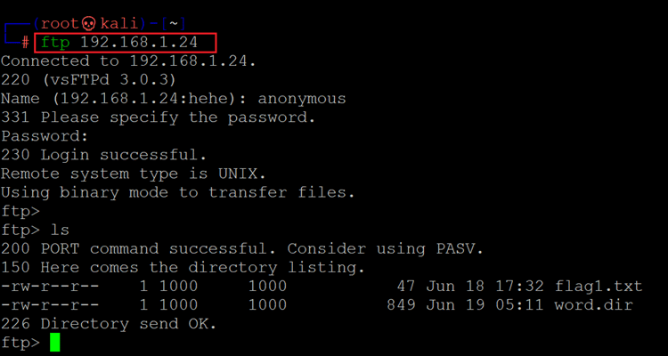 In this step, we will connect to the default FTP port, which was identified as open in the port scanning step.