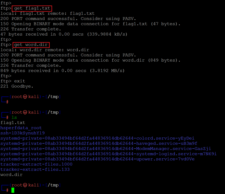 After logging into the target machine as FTP, we used the ‘ls’ command to check the current directory contents and found our first flag.