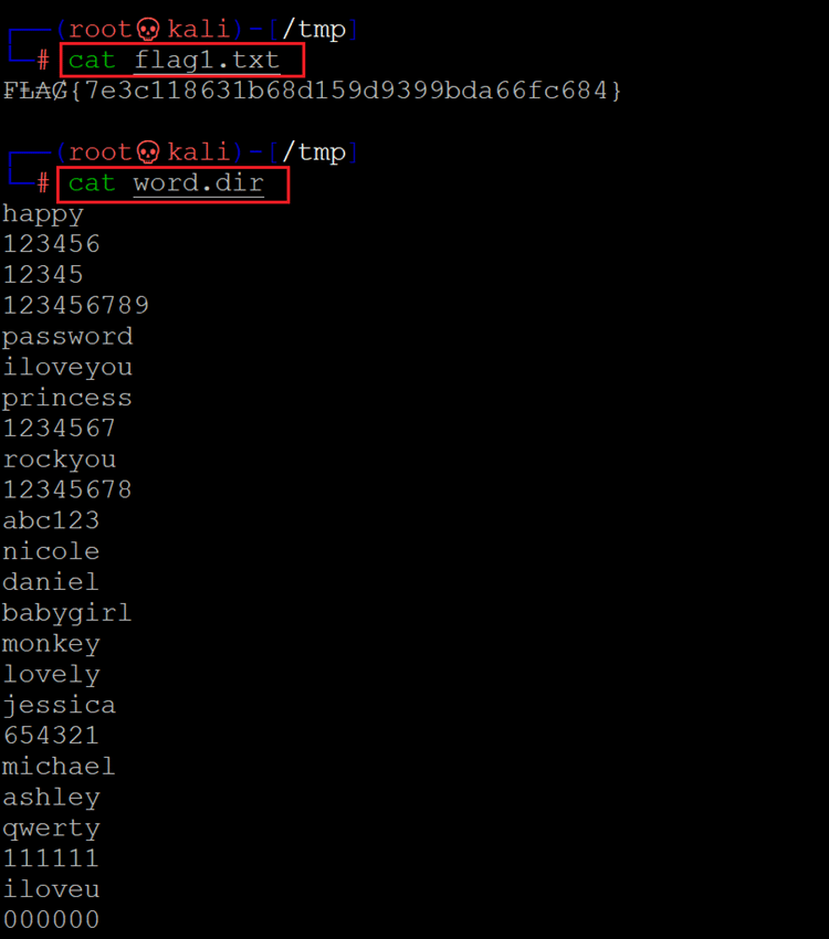 After downloading the files, we read the files using cat on our attacker machine. The flag1.txt file, which is our first flag, can be seen in the above screenshot. The second identified file, ‘word.dir,’ seems to be some wordlist. This can be used in many ways, but let us use this wordlist to identify more files on the target web application.