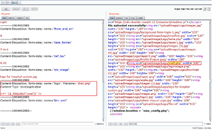 We have all the required information to upload a shell file through the file upload functionality. For this, we captured the file upload request and sent it into a burp repeater. We added the PHP command execution code in the request, as shown highlighted in the screenshot below.